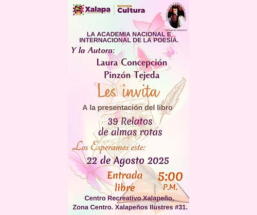 El viernes se presentará el libro “39 Relatos de almas rotas”, de Laura Concepción Pinzón Tejeda, en el CRX. A las 18:00 horas, en el Museo de la Música Veracruzana, se realizará el homenaje, inauguración de exposición y develación de placa en honor de María del Rosario Lomán Suárez.