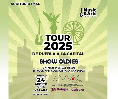 A las 16:00 horas, en el auditorio de la IMAC, se presentará el Tour 2025, de Puebla a la Capital, por Music and Arts Institute, y en Palacio Municipal, a las 17:00 horas, se realizará el tradicional “Danzón pa´l Corazón”. En el Teatro J. J. Herrera, a las 18:00 horas, se ofrecerá el concierto “Es una fiesta porque hay música”, del grupo Tisani.