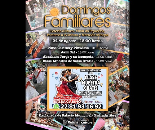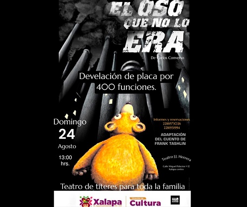 El domingo, en el Parque Juárez, se desarrollará el programa “Domingos Familiares”, desde las 12:00 horas. En el Teatro J. J. Herrera, a las 13:00 horas, se presentará la obra “El Oso que no lo era”, de Carlos Converso. Además, se develará una placa por sus 400 funciones. A esta misma hora, en el Museo de la Música Veracruzana, se presentará la Orquesta Pauta Nueva con una “Tarde de danzón”.