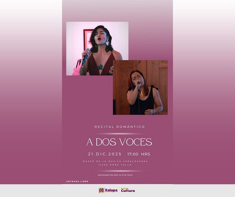 A las 17:00 horas, en el Museo de la Música Veracruzana, se realizará el recital romántico “A dos voces”, con la participación de Érika Chimal y Nora Guzmán; a la misma hora, en el Parque Juárez, se desarrollará el tradicional “Danzón Pa’l Corazón”.