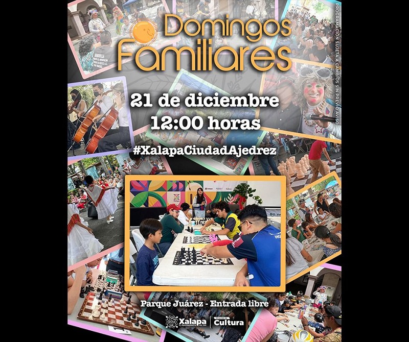 A las 12:00 horas, en el Parque Juárez continuará el programa “Domingos Familiares”, con “Xalapa, Ciudad Ajedrez”.