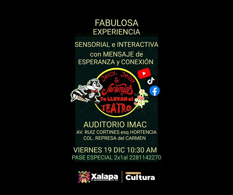 El viernes, a las 10:30 horas, en el auditorio de la IMAC, se presentará la experiencia infantil Jeicy, Jeiby y Jeremías. A las 18:00 horas, el Museo de la Música Veracruzana albergará el ciclo de coros Camerata Coral, de la Universidad Veracruzana; de forma paralela, en el CRX, se tendrá el concierto “Migajerxs, el Musical”.