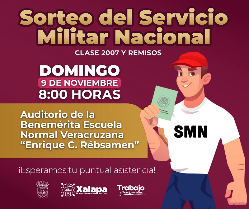 Xalapa, Ver.- El Ayuntamiento de Xalapa, a través de la Secretaría y la Junta Municipal de Reclutamiento, invita a jóvenes de la Clase 2007 y Personal Remiso al Sorteo del Servicio Militar Nacional, el cual se llevará a cabo el domingo 9 de noviembre a las 8:00 horas, en el auditorio de la Benemérita Escuela Normal Veracruzana “Enrique C. Rébsamen”.