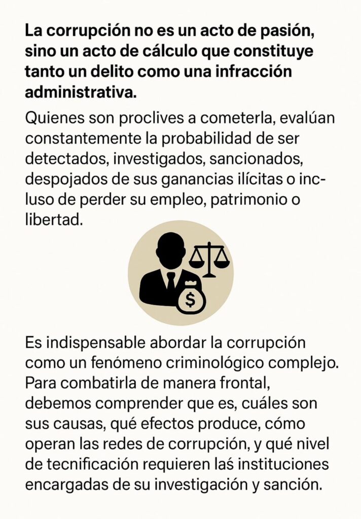 Es indispensable abordar la corrupción como un fenómeno criminológico complejo. Para combatirla de manera frontal, debemos comprender qué es, cuáles son sus causas, qué efectos produce, cómo operan las redes de corrupción, y qué nivel de tecnificación requieren las instituciones encargadas de su investigación y sanción.