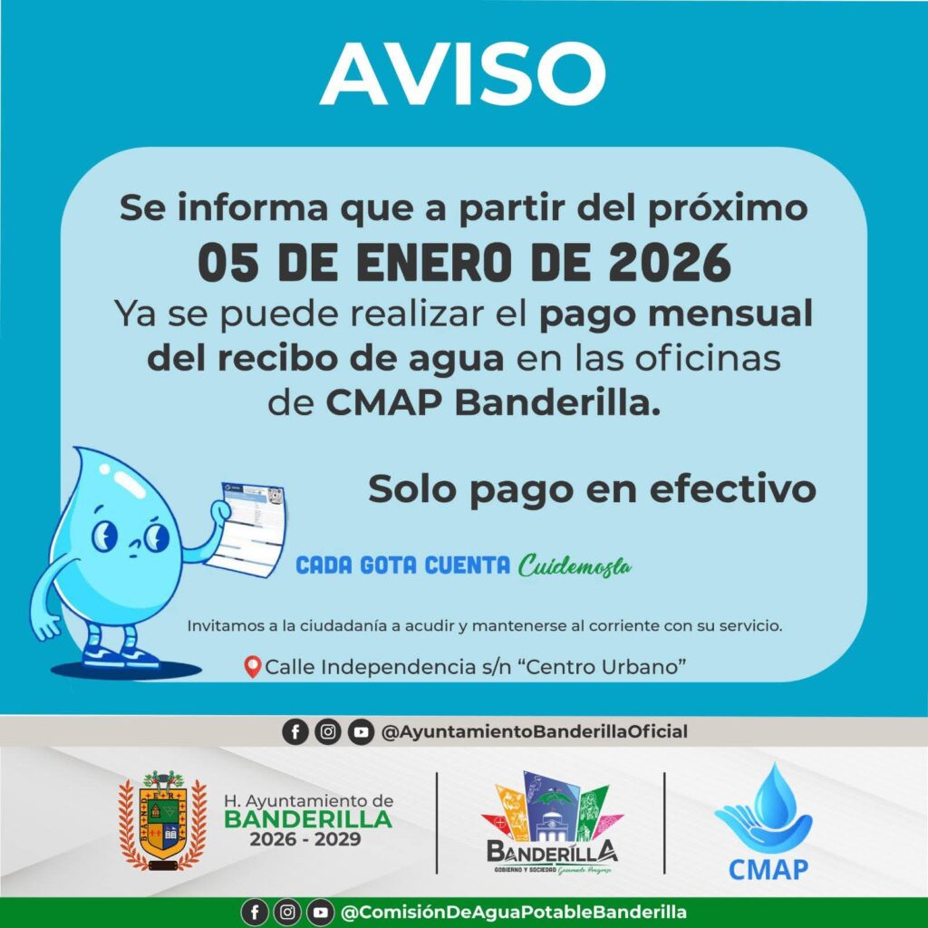 Asimismo, el gobierno municipal de Banderilla, Ver., informa que el pago del servicio mensual de agua potable ya puede pasar a realizarse en las instalaciones de la Comisión Municipal de Agua Potable (CMAP), situada en la calle Independencia No. 74 en el Centro Urbano, mejor conocido como Recinto Ferial.