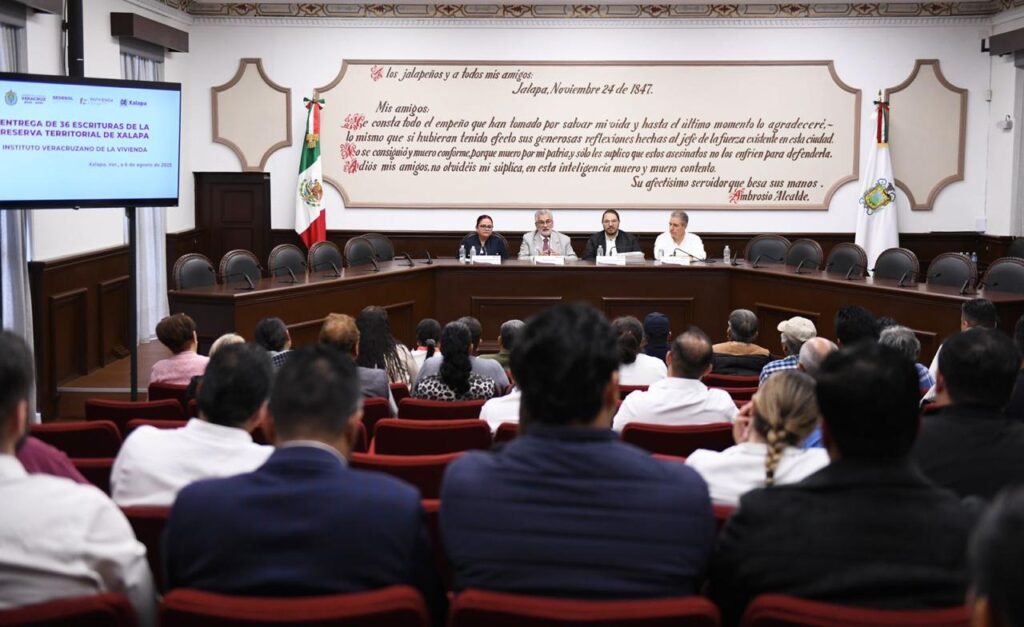 Xalapa, Ver.- El trabajo coordinado de los tres órdenes de Gobierno permite dar resultados y brindar certeza jurídica al patrimonio de las y los xalapeños, afirmó el alcalde Alberto Islas Reyes, al encabezar la entrega de escrituras en beneficio de 36 familias de la Reserva Territorial de Xalapa.