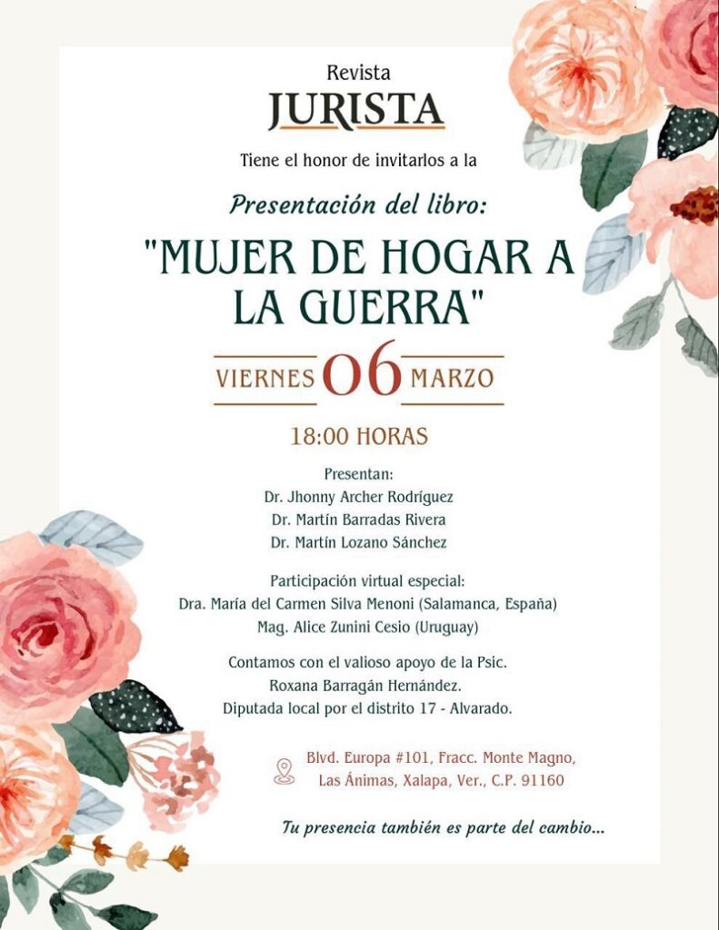 La revista revista Jurista invita al público a la presentación del libro Mujer de hogar a la guerra, un evento académico y cultural que reunirá a especialistas y participantes internacionales este viernes 6 de marzo a las 18:00 horas en la ciudad de Xalapa.