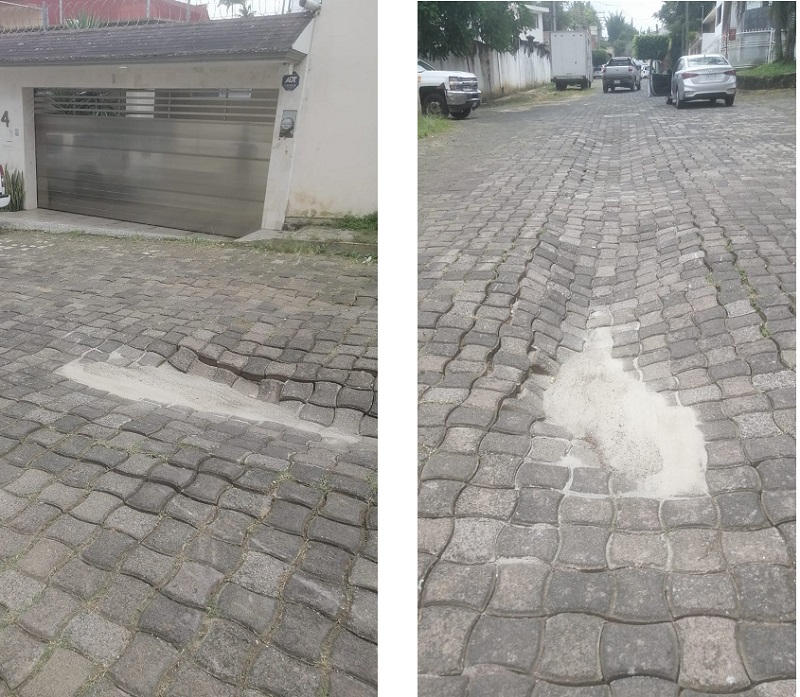 Vecinos piden la atención de la Comisión Municipal de Agua del Ayuntamiento de Xalapa para que atienda el hundimiento que se ha presentado en la calle Hayas, a la altura del número 4, en el fraccionamiento Jardines y Fuentes de las Ánimas, que ya causó problemas porque la llanta de un coche se quedó atorada en esa hendidura.