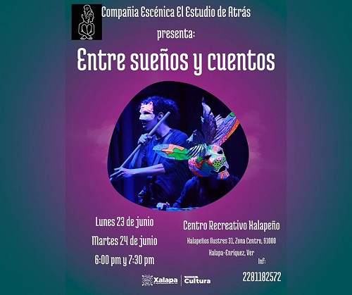 A las 18:00 y 19:30 horas, en el Centro Recreativo Xalapeño (CRX), la compañía escénica “El Estudio de Atrás” presentará “Entre sueños y cuentos”, obra que tendrá una doble función el martes 24 de junio.