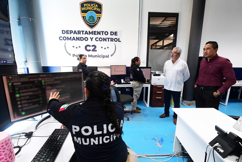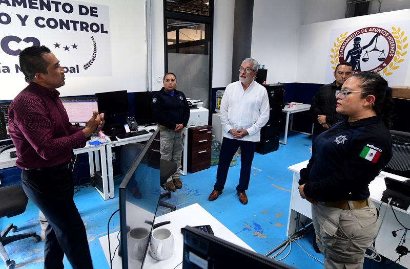 Acompañado por el director de la Policía Municipal, Eduardo Lara García, el Alcalde también reconoció la labor que se realiza en el Departamento de Comando y Control (C2), unidad que ahora está directamente vinculada con la Secretaría de Seguridad Pública (SSP) para agilizar los tiempos de atención a la ciudadanía e inhibir la comisión de delitos.