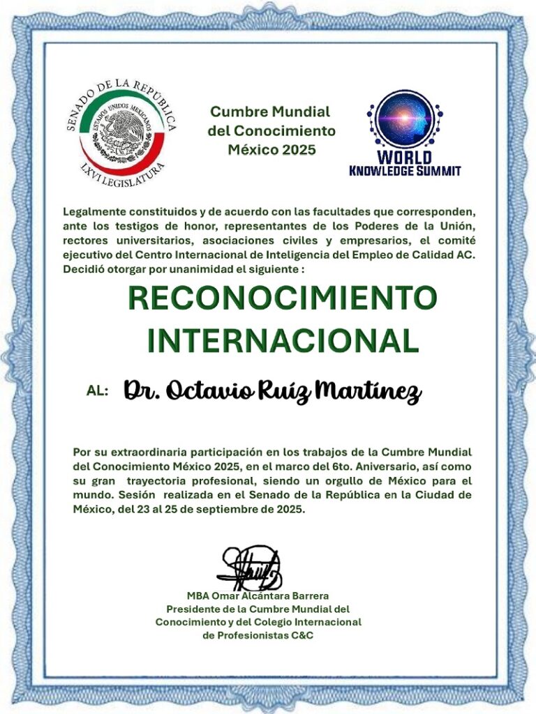 El director de revista Jurista, Octavio Ruiz Martínez, recibió un reconocimiento por parte de los organizadores de la Cumbre Mundial del Conocimiento México 2025, que se realizó teniendo como sede el Senado de la República, del 23 al 24 de septiembre del presente.