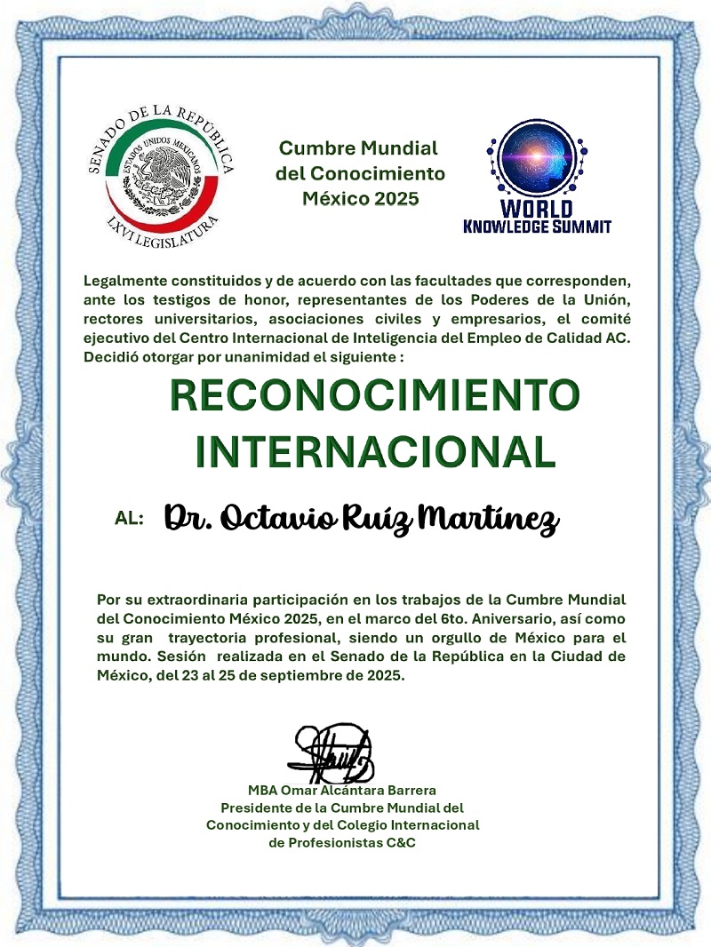 Reconocimiento a Octavio Ruiz en la Cumbre Mundial del Conocimiento 2025