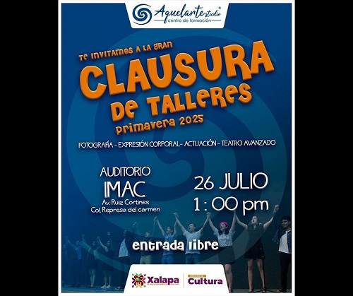 A las 13:00 horas, en el auditorio de la IMAC, se clausuran los Talleres Primavera 2025 de Aquelarte Studio, con muestras de fotografía, expresión corporal, actuación y teatro avanzado.