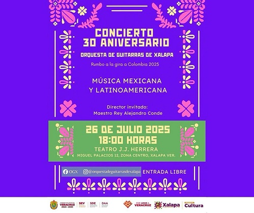 A las 18:00 horas, el Teatro J. J. Herrera recibirá a la Orquesta de Guitarras de Xalapa con su concierto de 30 aniversario y repertorio de música mexicana y latinoamericana.