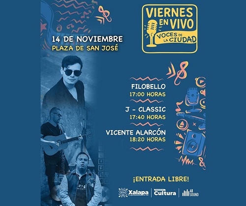 A las 17:00 horas, en la plaza de San José, se desarrollará el programa “Viernes en vivo, voces de la ciudad”, con la presentación de Filobello, J-Classic y Vicente Alarcón. Una hora más tarde, en el Museo de la Música Veracruzana, se develará la placa de la maestra Messe Merari; a esta misma hora, en el Muxa, se proyectará el corto documental “Estadio Xalapeño Heriberto Jara Corona, 100 años de historia”.