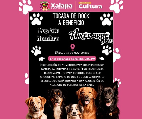 A las 19:00 horas, en Xallitic, se tendrá una tocada de rock en beneficio de los refugios de animales “Los sin nombre” y “Aquelarre y CIA”. Se recibirá alimento como croquetas.