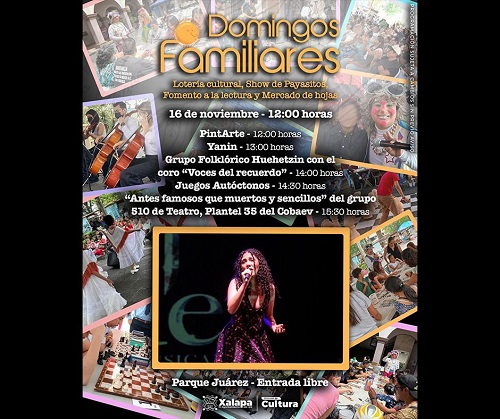 A las 12:00 horas en el parque Juárez se desarrollará el programa “Domingos Familiares”. A las 13:00 horas se tendrá el recital de fagot y piano de Ricardo Hernández. A las 17:00 horas en el parque Juárez se realizará el tradicional “Danzón pal corazón”.