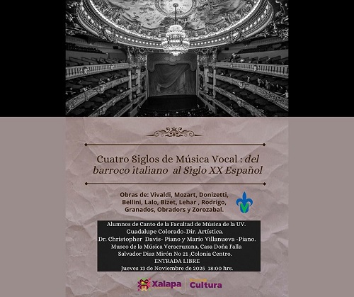 Una hora más tarde, en el Museo de la Música Veracruzana, se realizará el concierto “Cuatro siglos de música vocal, del barroco italiano al siglo XX español”; a esta misma hora, en el Teatro J. J. Herrera, se proyectará “Ya México no existirá más”, en el marco del Festival del Cortometraje Veracruzano.